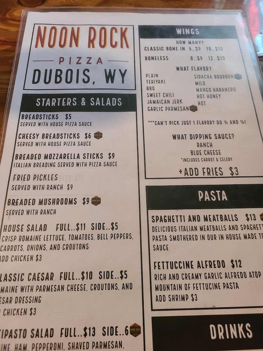 Welcome to Noon Rock Pizza, a delightful find nestled in Dubois, WY. This pizzeria is rapidly gaining a reputation for its scrumptious dishes and warm service. The menu features a variety of tantalizing options, including the standout Cluckin Alfredo Wrap for $14.00 and the irresistible Smokey Joe pizza, available in both 9” for $15.00 and 14” for $23.00.